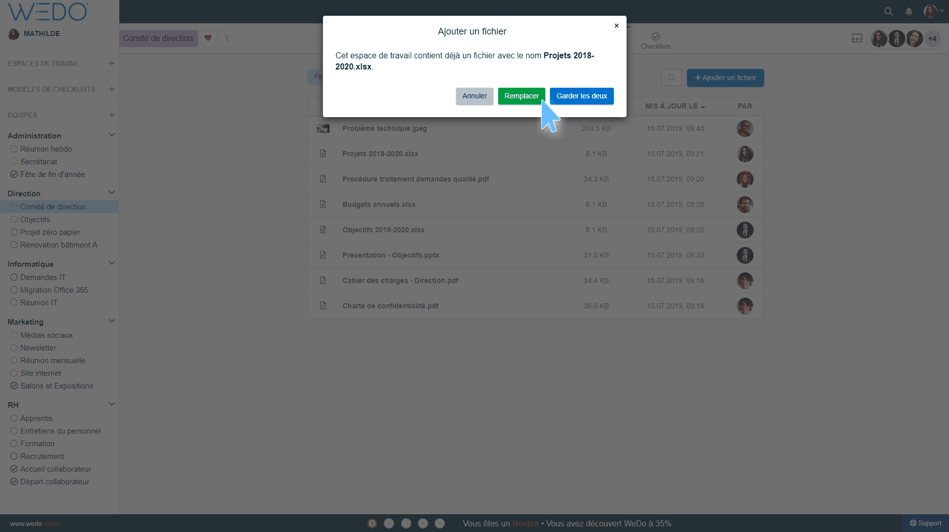 WEDO now handles conflicts between different versions of the same file. When a file of the same format and name is added to the workspace, WEDO informs you and gives you two options for handling the conflict: