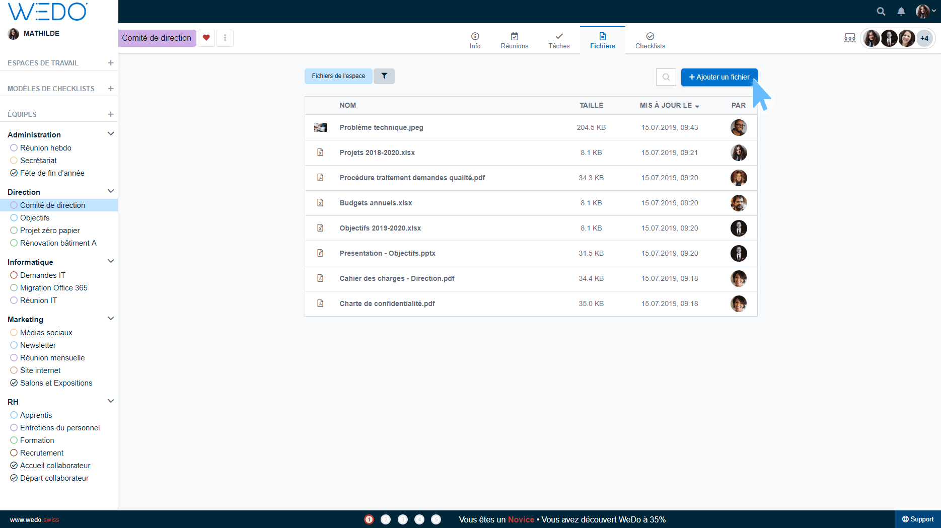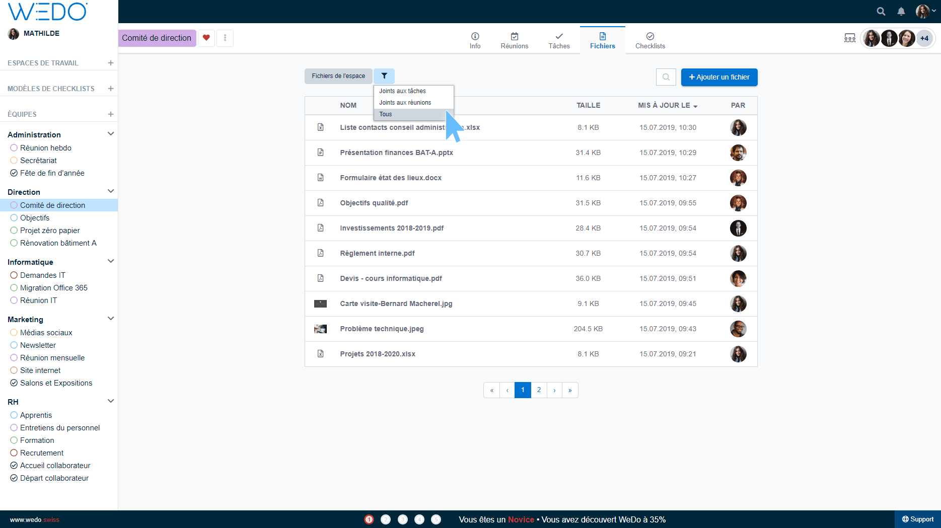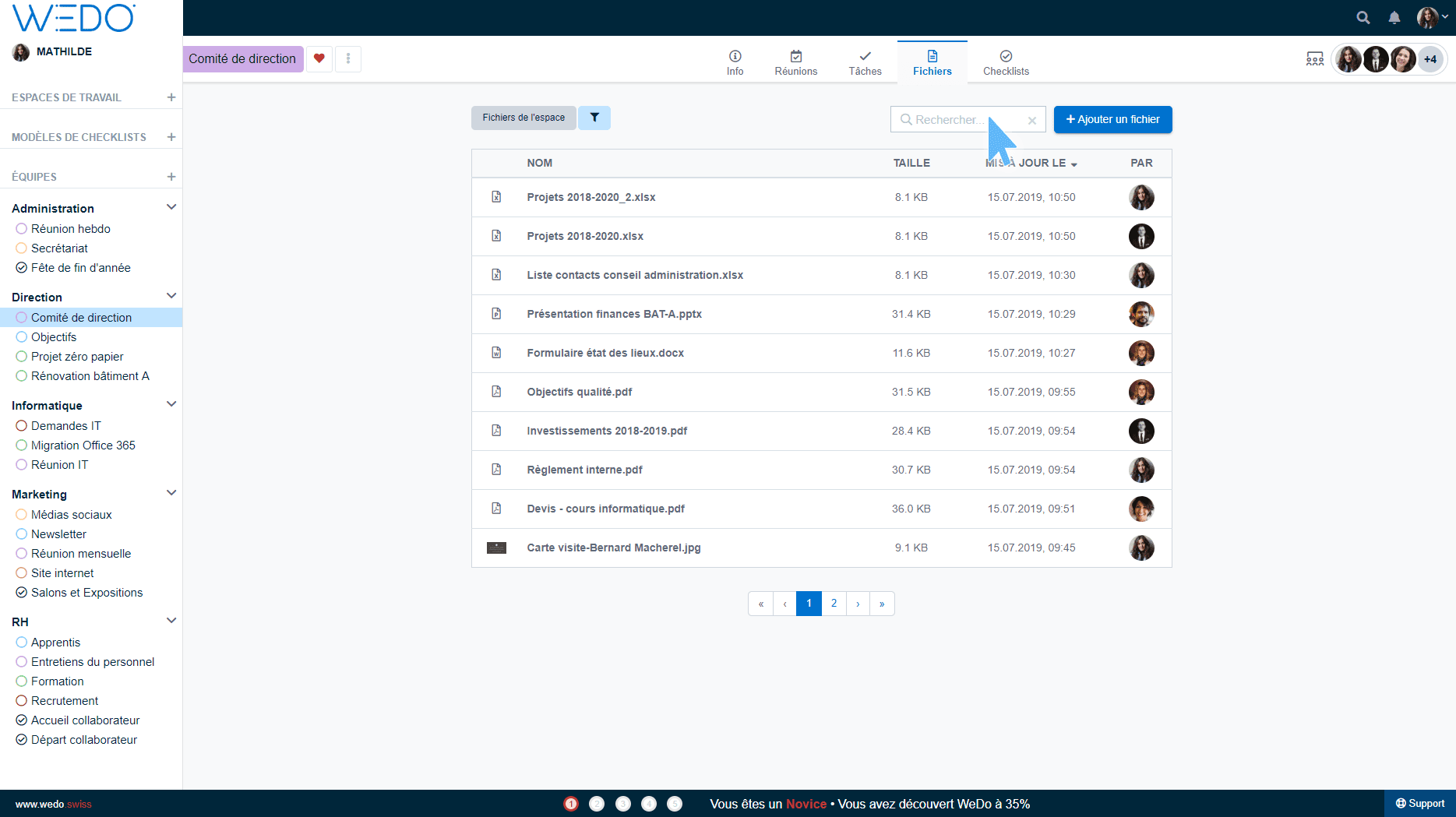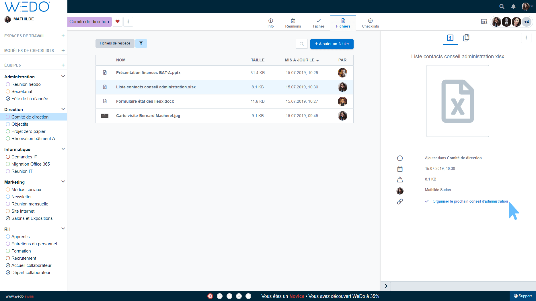 The Files tab, present in each workspace, works now like a folder. What are the major changes compared to the previous version? No more need to add the same file several times! Files added to the workspace can now be taken back in the future to be attached to a task or agenda item without having to go back to your computer folders. Want to rename, replace or delete a file? All this is now possible at From the Files tab!