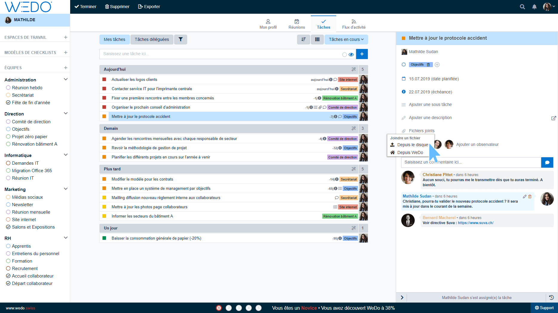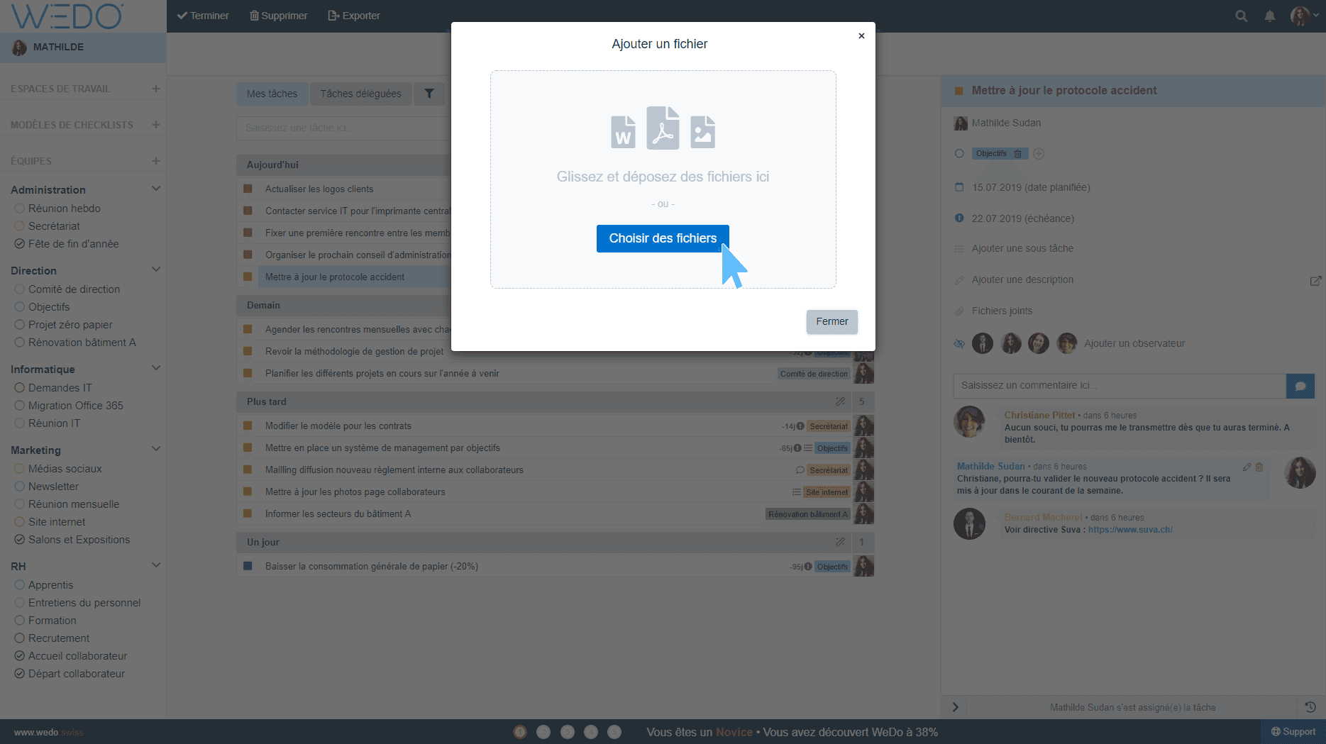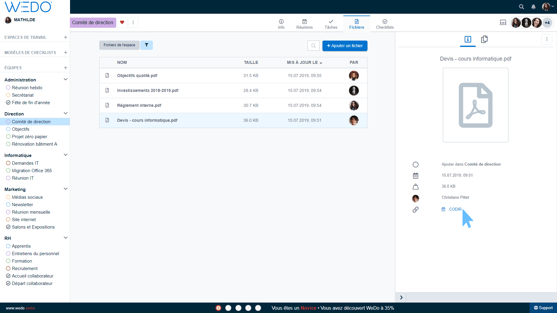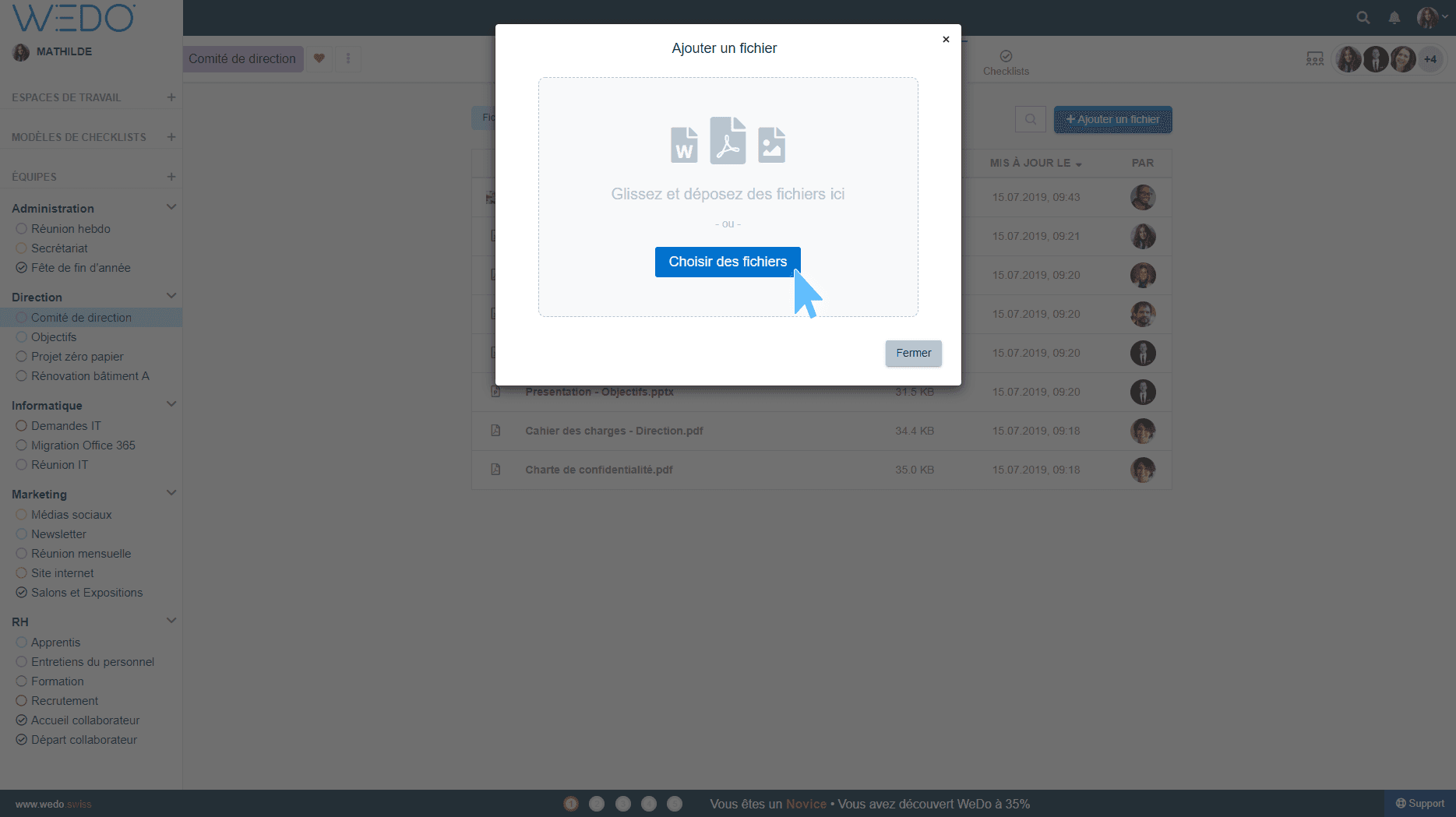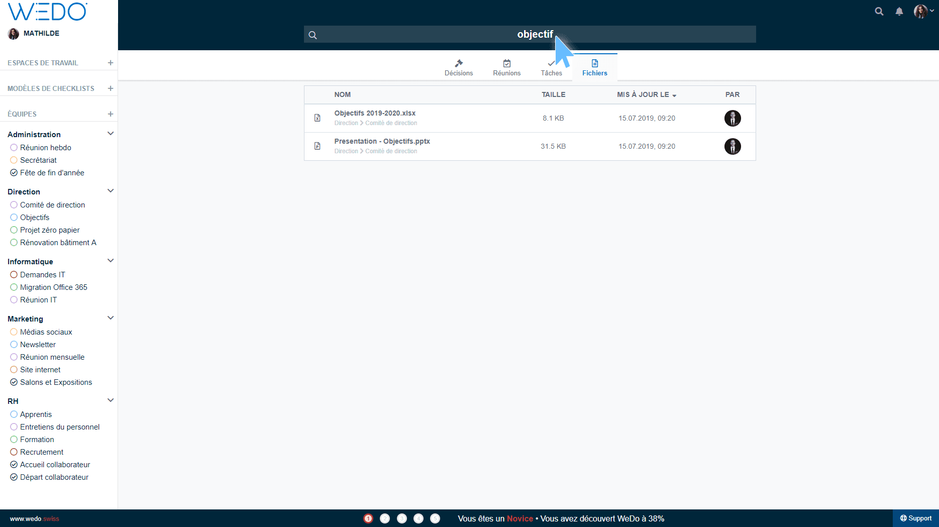 The Files tab, present in each workspace, works now like a folder. What are the major changes compared to the previous version? No more need to add the same file several times! Files added to the workspace can now be taken back in the future to be attached to a task or agenda item without having to go back to your computer folders. Want to rename, replace or delete a file? All this is now possible at From the Files tab!
