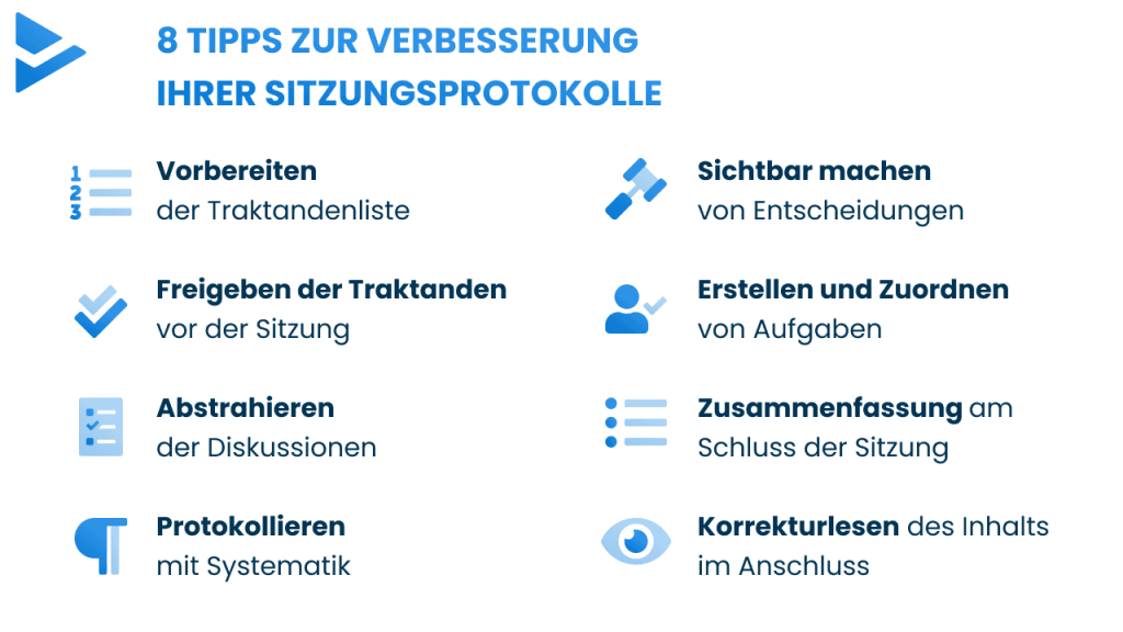 Werfen Sie einen kurzen Blick auf die folgende Grafik, um eine Zusammenfassung der acht wesentlichen Tipps zu sehen, die Ihnen beim Erstellen effektiver und prägnanter Sitzungsprotokolle helfen.