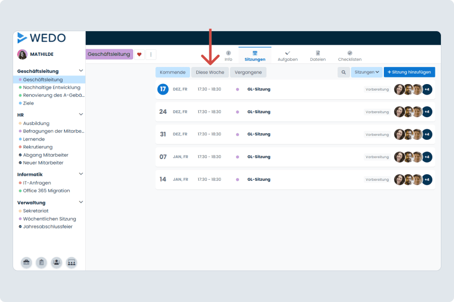 Die Registerkarte Sitzungen enthält neue Standardfilter. In den Arbeitsbereichen und auch in Ihrem persönlichen Bereich finden Sie die Sitzungen nach kommende, diese Woche und vergangene sortiert.