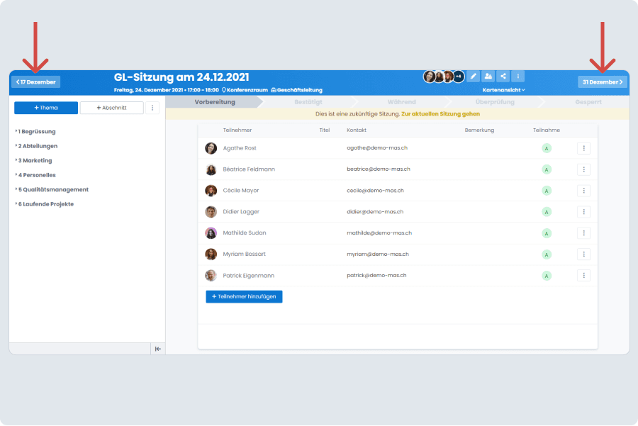 Ob wiederkehrende oder aufeinanderfolgende Sitzungen: Mit den neuen Schaltflächen oben links und oben rechts können Sie zwischen den Sitzungen wechseln. Ein Banner zeigt Ihnen dann auch an, ob Sie sich in einer vergangenen oder zukünftigen Sitzung befinden und ermöglicht es Ihnen in einem Klick zur aktuellen Sitzung zurückzukehren.
