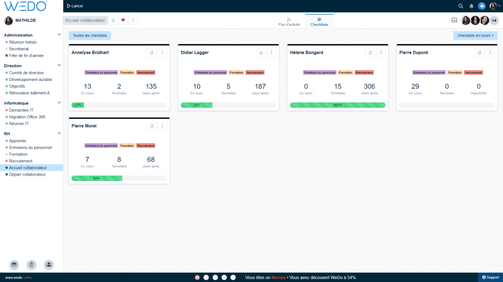 A l’ère du digital, il existe des outils qui permettent de centraliser les informations dans un même endroit accessible à tous. WEDO vous permet de collaborer facilement autour de procédures récurrentes qui concernent plusieurs collaborateurs de différents services. Si vous souhaitez savoir où vous en êtes dans les accueils de vos collaborateurs, il vous suffit de cliquer sur Accueil collaborateur pour constater que vous avez cinq checklists en cours. Dans chaque checklist, vous pouvez voir en temps réel, quelles sont les tâches terminées et qui s’occupent des tâches en cours et pour quand.