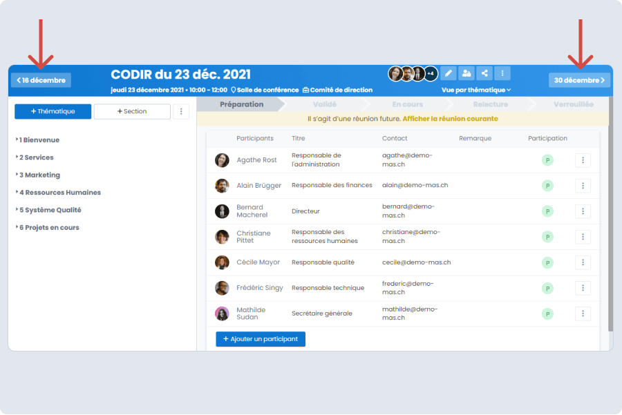 - Le contenu d'une réunion à venir peut être créé de façon dynamique grâce à la possibilité de statuer sur des thématiques.