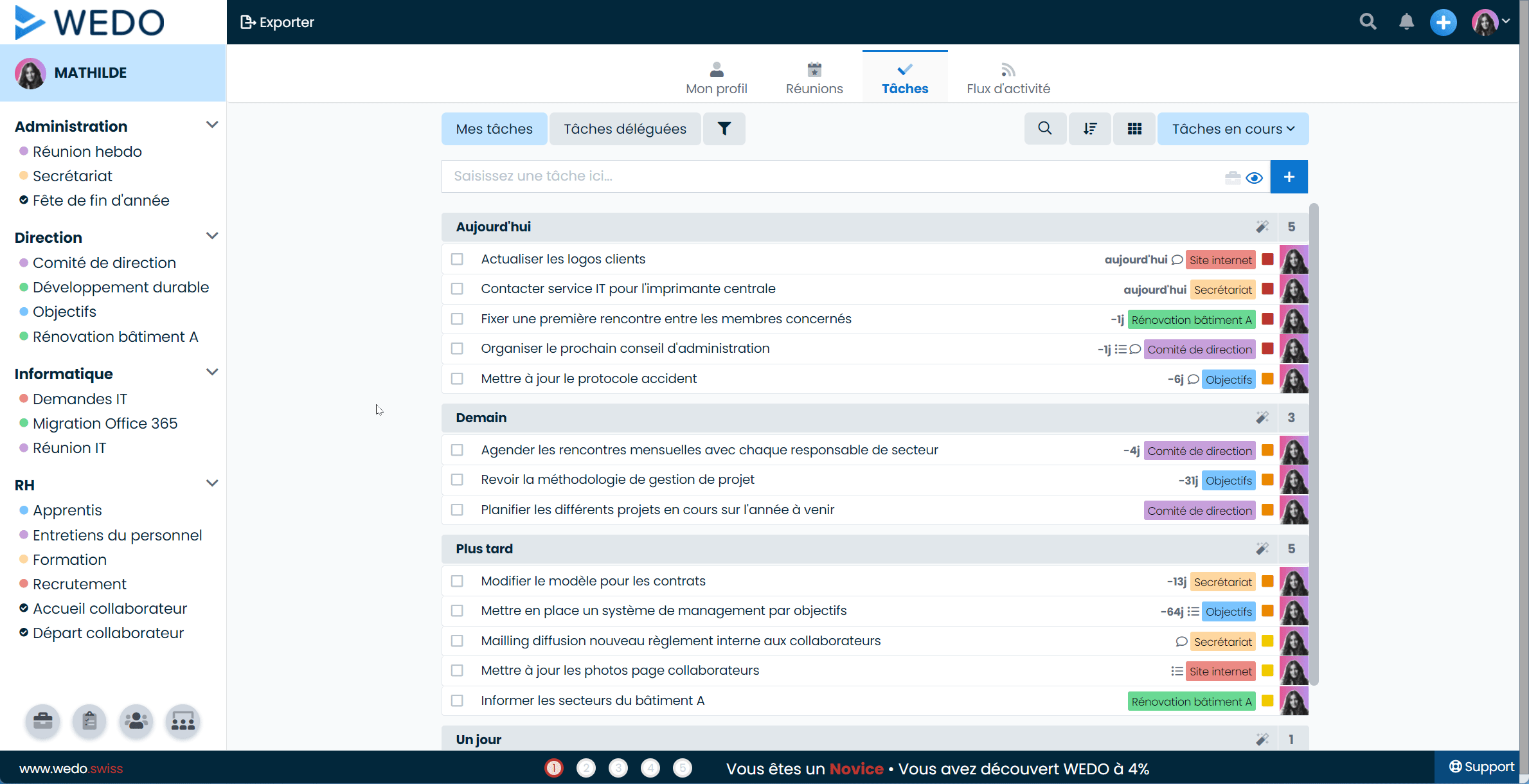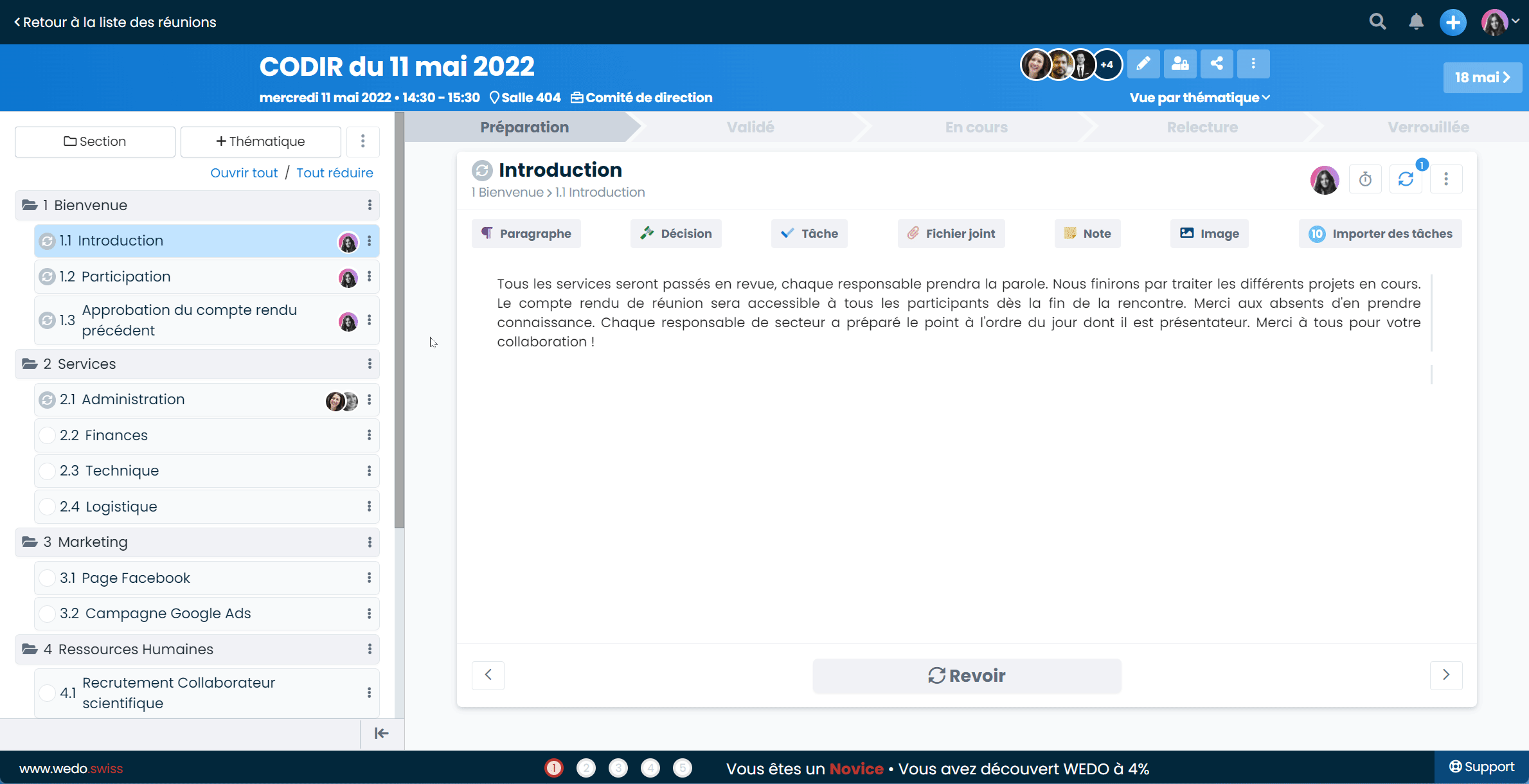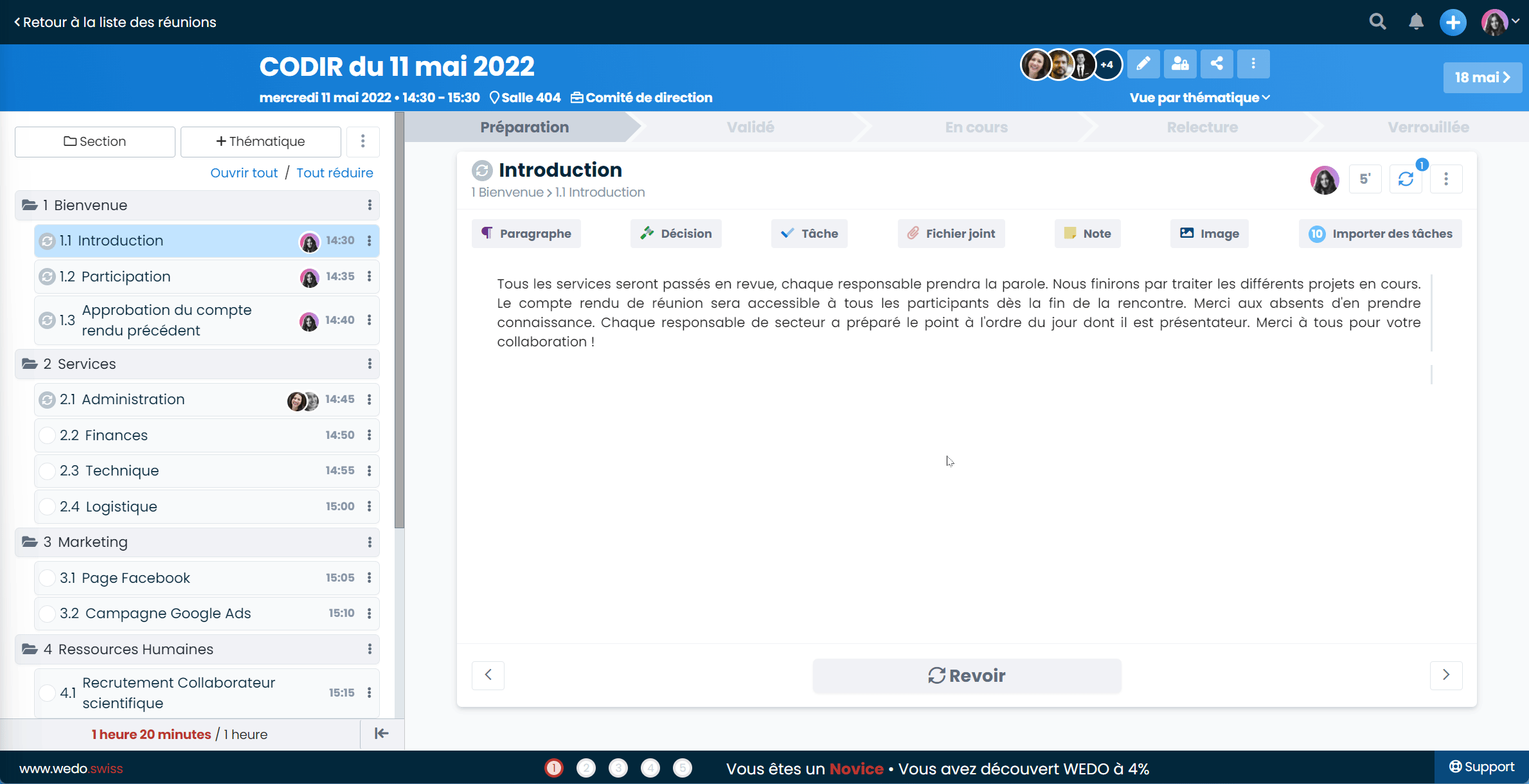 WEDO a notamment pour mission d’optimiser la durée de vos réunions. Cette nouvelle mise à jour rejoint donc cette ambition ! Vous pouvez désormais fixer le temps imparti à chaque thématique de votre ordre du jour. Ainsi, vous gardez un œil sur la durée de votre réunion et vous veillez à traiter tous les points dans le temps maximal fixé. Découvrez également les dernières optimisations apportées au module réunion afin de faciliter toujours plus la gestion et le suivi des réunions.