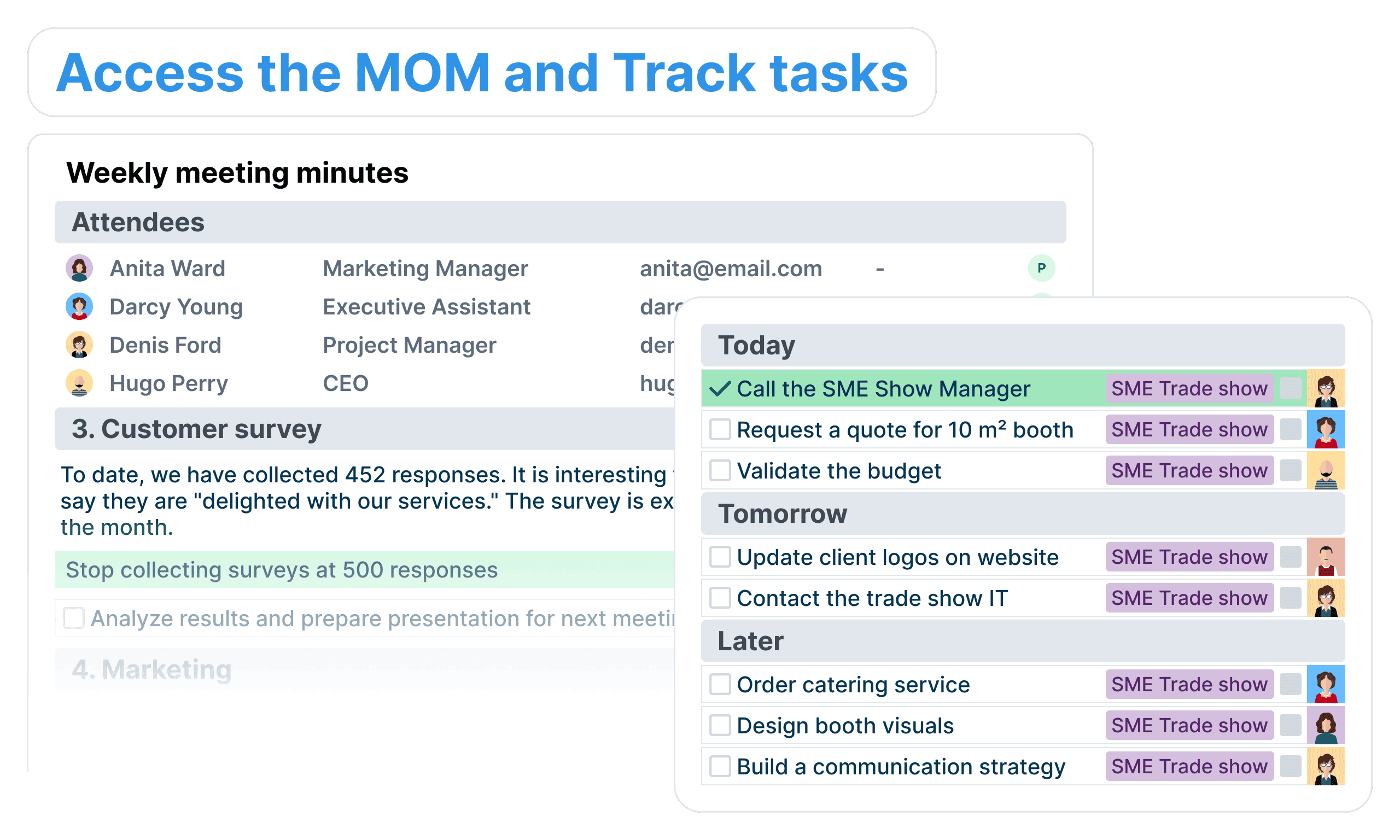 Make post-meeting follow-up easy by giving instant access to the meeting minutes with integrated task progress.