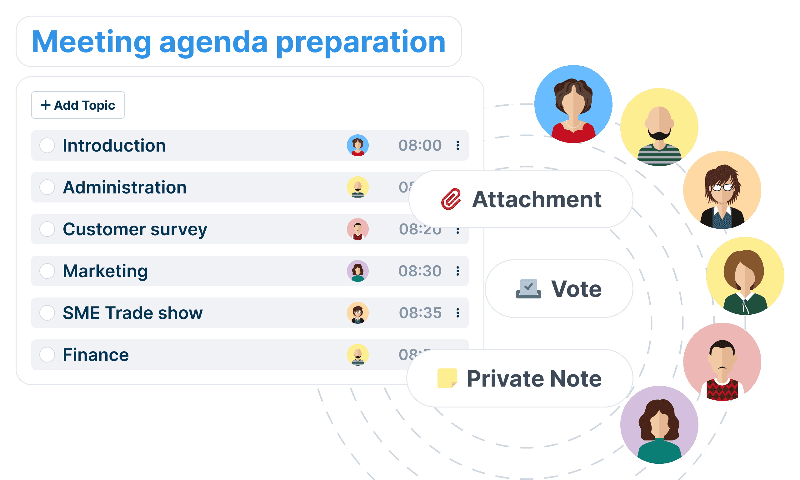 Having a productive conversation is rare when nobody has a plan for what to talk about. With WEDO, your team can collaborate on an agenda, prepare materials in advance, and write questions to ask during the meeting.