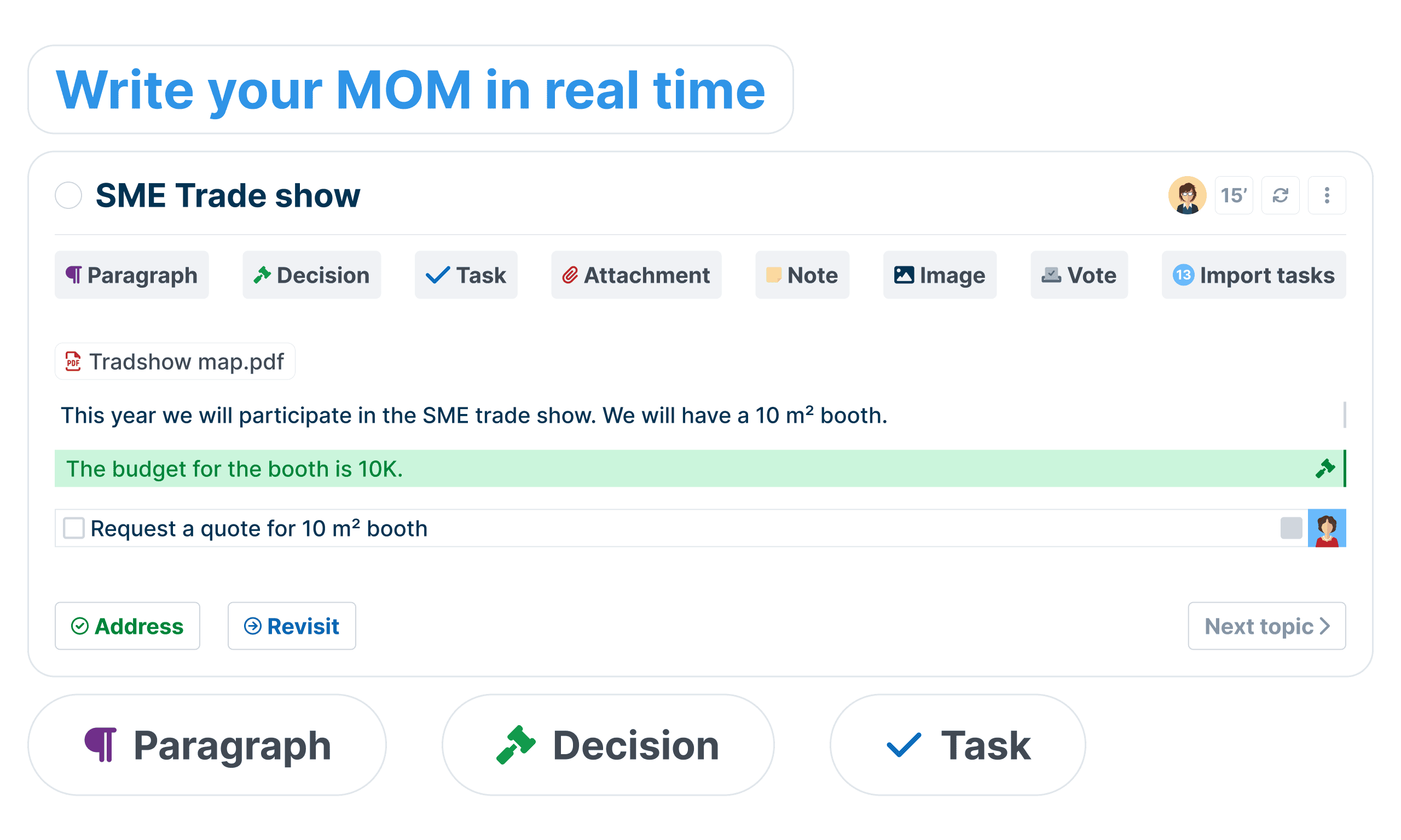 Take your minutes during the meeting and allow everyone to be up to date directly at the session's end.