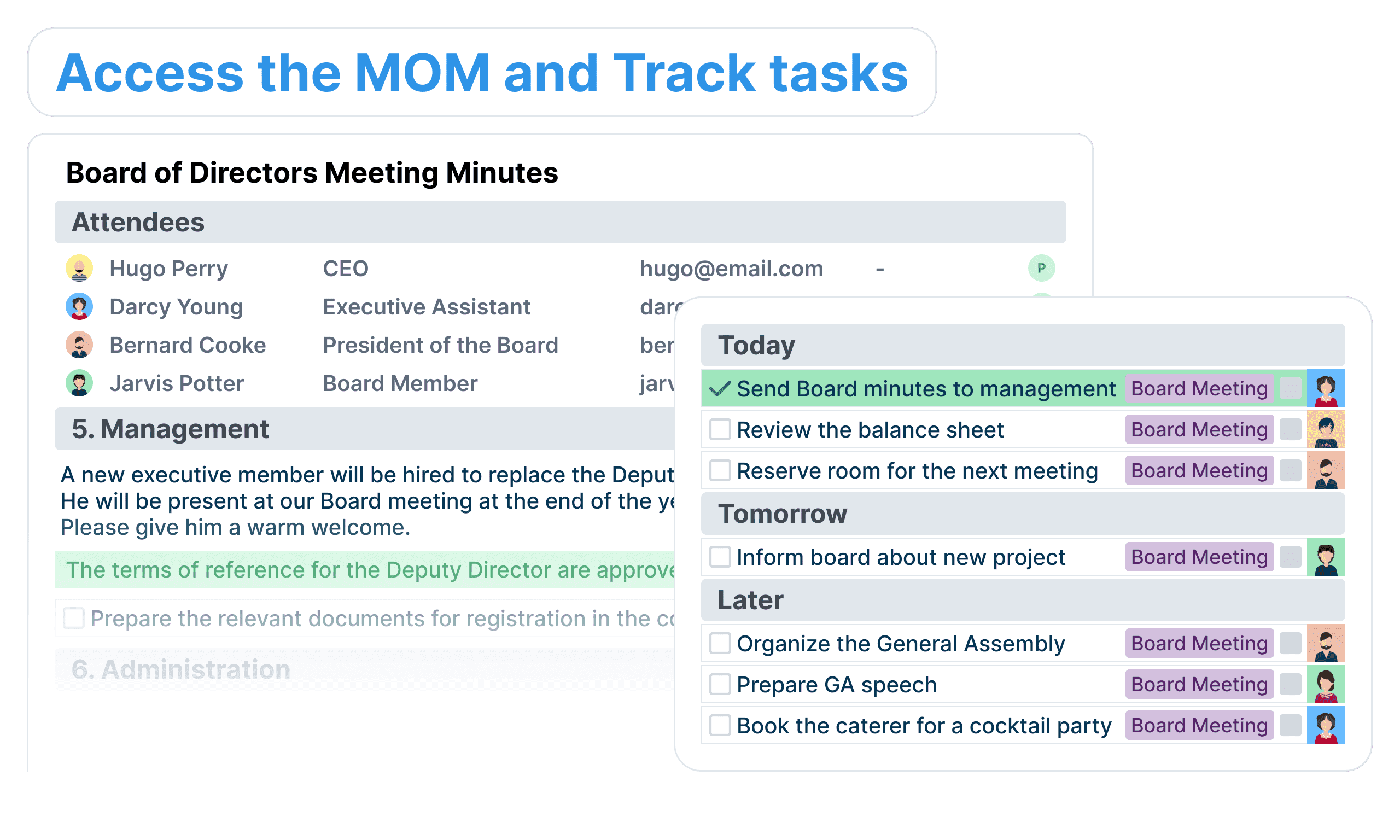 Make post-meeting follow-up easy by giving instant access to the meeting minutes with integrated task progress.