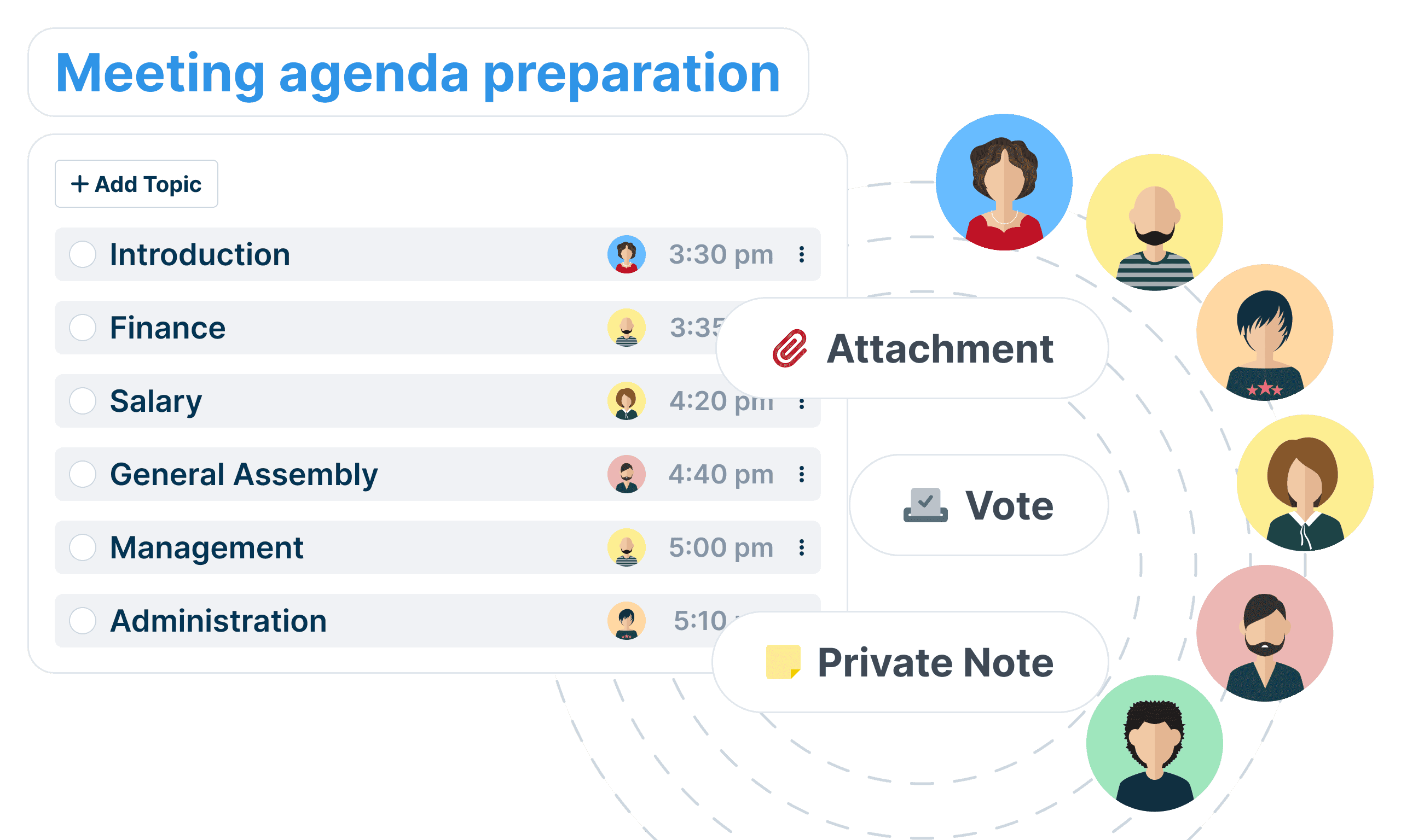 Keep control over the duration of your meetings by setting the time allocated to each topic on your agenda.