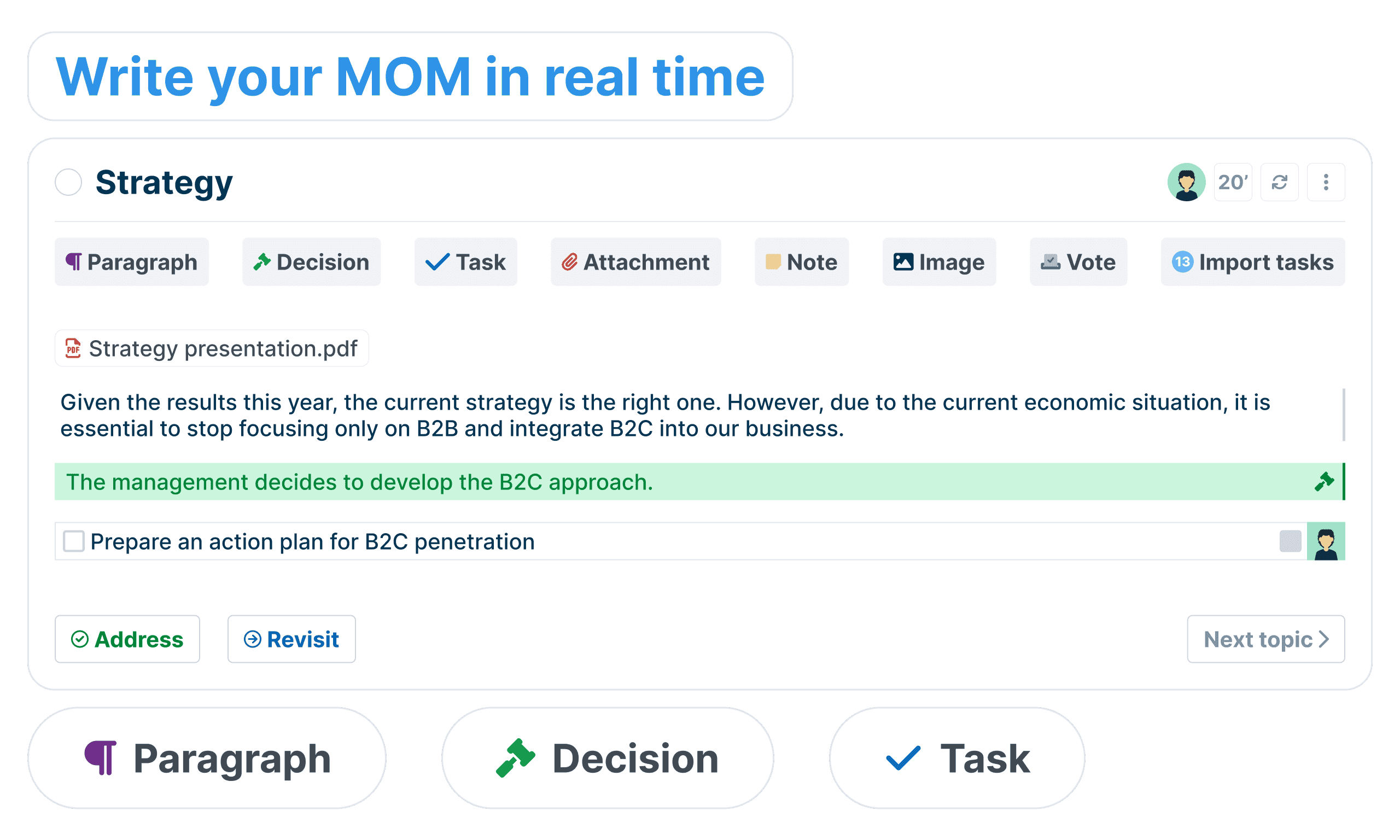 Write your meeting minutes. Add notes, validate decisions and add tasks to your agenda items in real time. WEDO’s real-time notetaking tool promotes collaboration and encourages everyone to participate actively in the conversation.