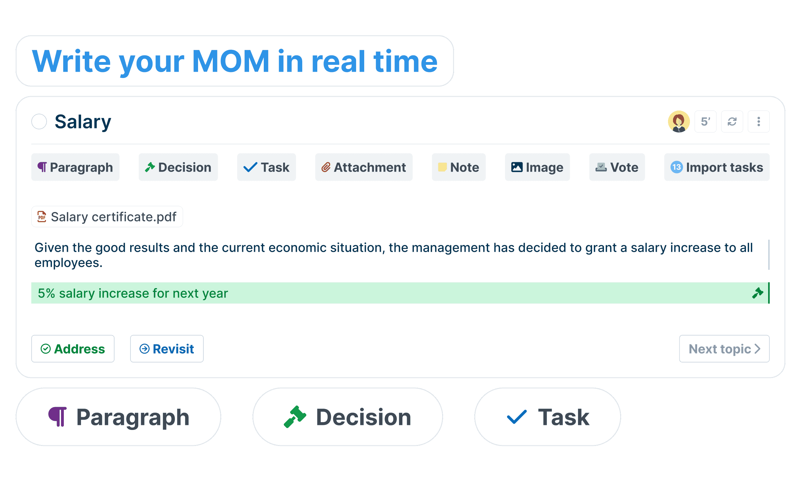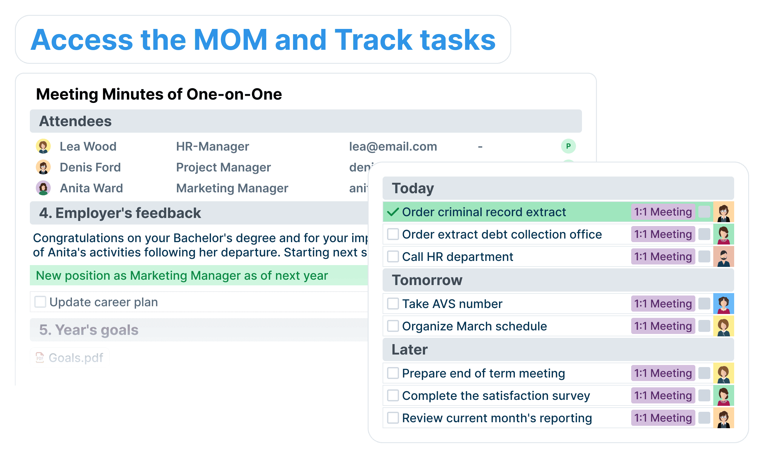 Great managers encourage ongoing learning, professional development, and real-time feedback. During your meeting, both you and your report can add items to the agenda, discuss them using comments, takes notes and summarize critical decisions and tasks.