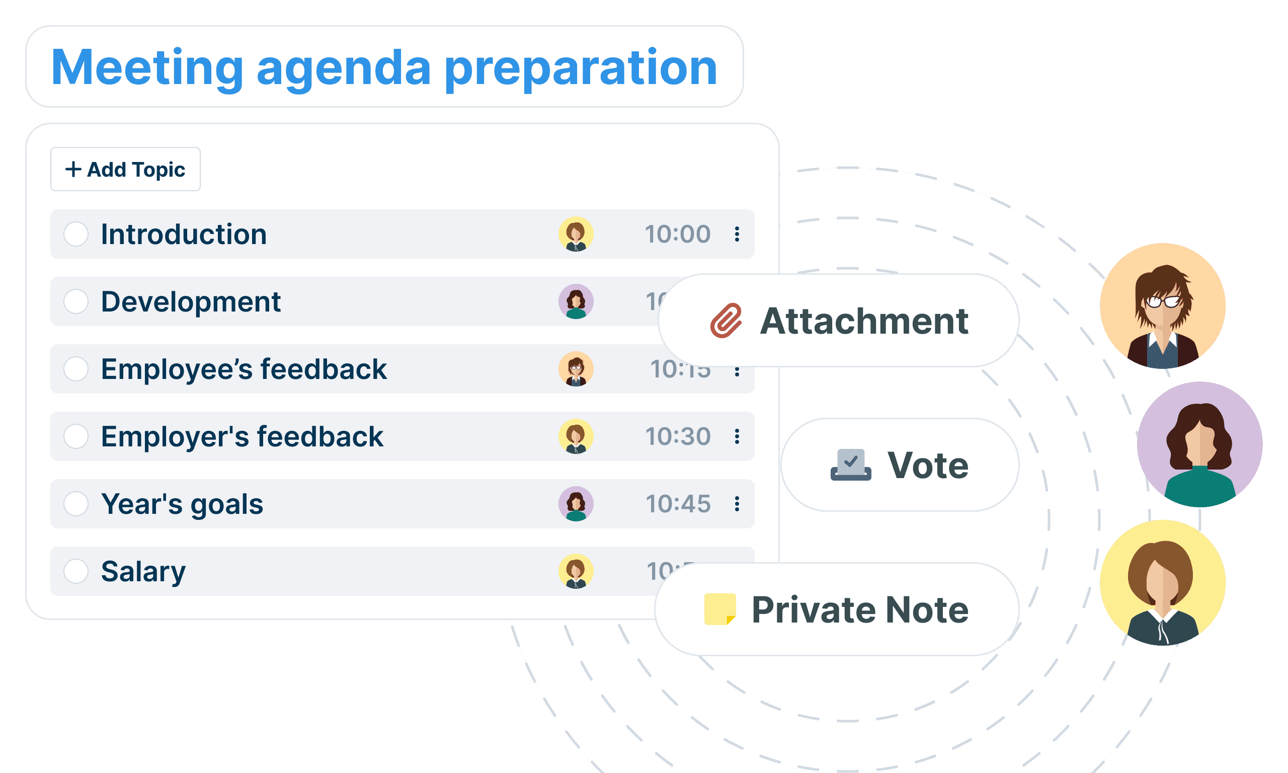 Keep control over the duration of your meetings by setting the time allocated to each topic on your agenda.